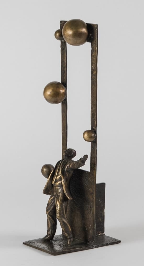 Skulpturen viser med al tydelighed, at manden magter at have mange bolde i luften.